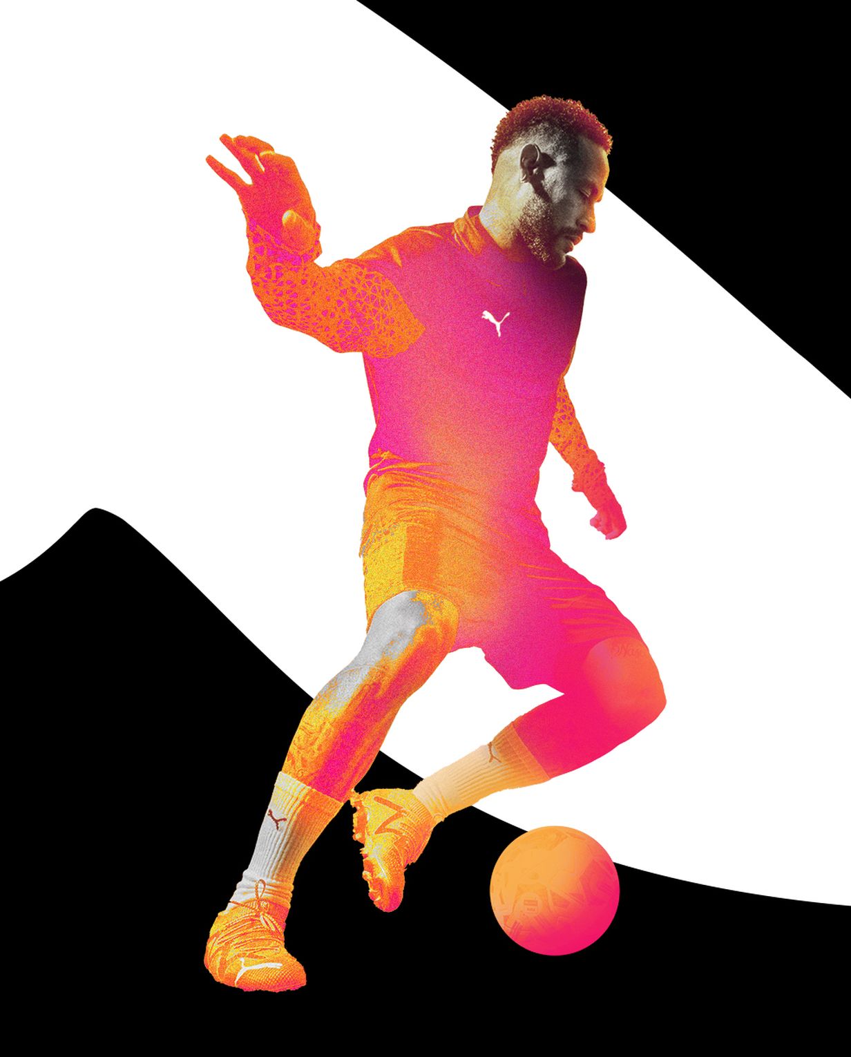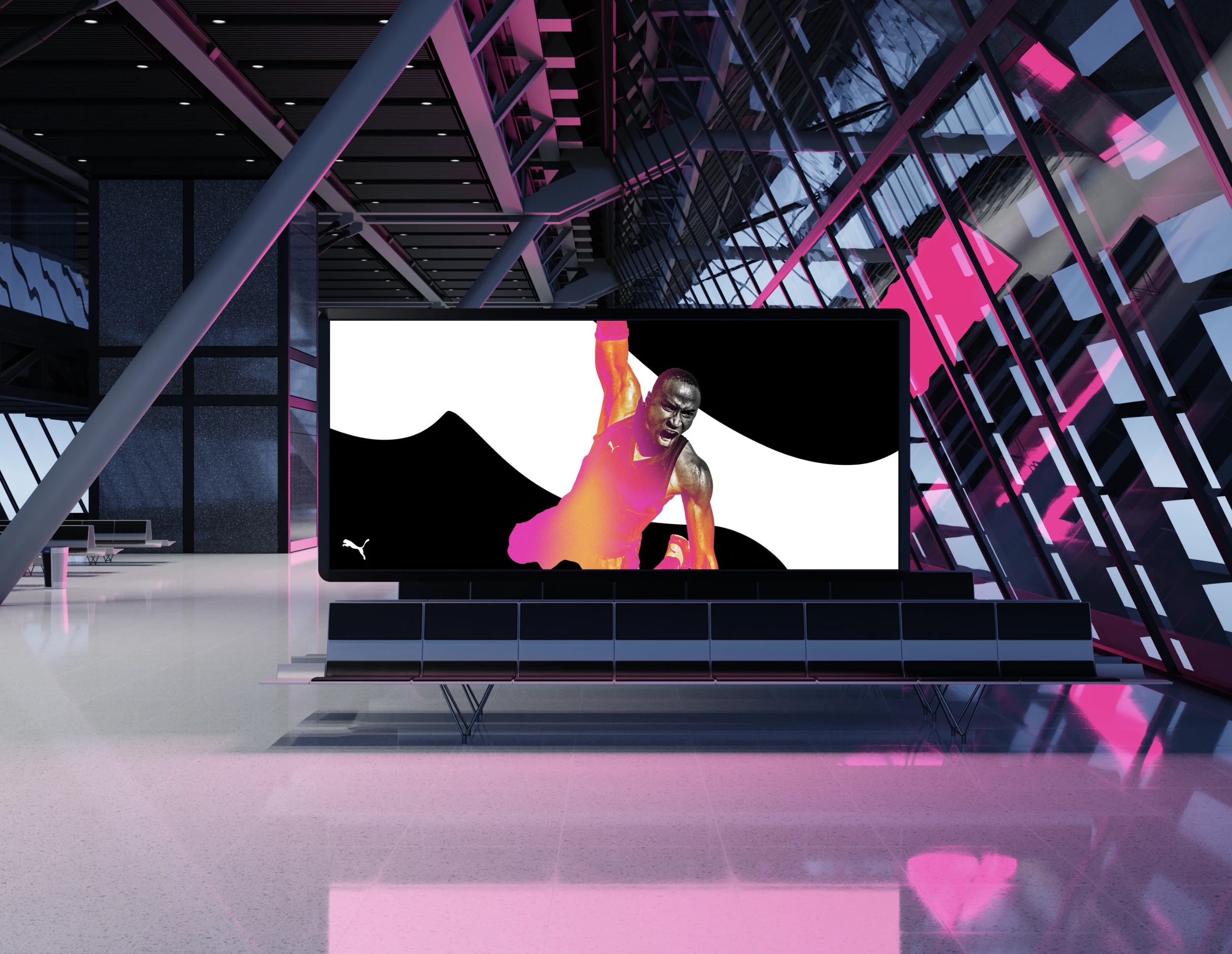 An expressive visual identity that leans on the visualisation of the winning moment — scoring that goal, dunking that basket, taking it around that player — and the emotional and chemical makeup of the athlete in that instant coming to life in the outward facing view of the world. This is expressed in the form of a heat map style aesthetic, something that feels scientific, energetic and crucially connected to the already established visual language of the Puma Nitro product across all major sports events in 2024. All imagery FPO and ⓒ of their respective owners.